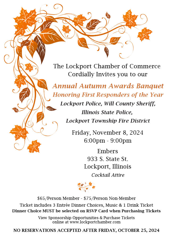 Please join us for an evening of appreciation as we Honor the First Responders of the Year from the Lockport Police Department, Lockport Township Firefighters & Paramedics of the Lockport Township Fire District, Will County Sheriff Deputies and the Illinois State Troopers. Show your expression of thanks and gratitude to our local heroes for the difficult job they do while putting their lives on the line to protect our community by attending this event.