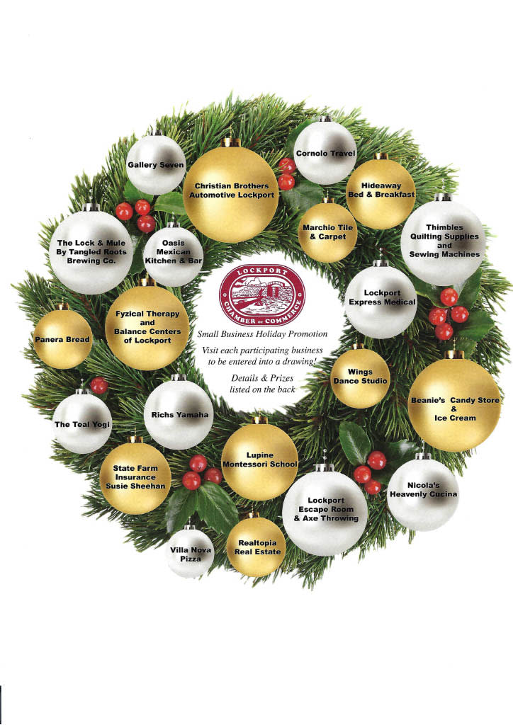 The Lockport Chamber of Commerce is running a Holiday Promotion leading up to Small Business Saturday. The promotion will run Monday, November 11th- Saturday, November 30th Here are the Details: 1. Consumers will pick up a game board at any participating business or at the Lockport Chamber of Commerce office. (location details to follow) 2. All participating business, their addresses and details will be printed on the back of the wreath. 3.Consumers must visit each business location on the game board to get your “space or ornament” stamped. 4.When the game board is filled, consumers will return it to the Lockport Chamber or any participating business. 5.On Saturday, November 30th, Small Business Saturday AND Christmas in the Square, all returned game boards will be entered into a drawing for prizes. 6.Drawing will take place on Saturday, November 30th at 3pm at Christmas in the Square. Prizes include: 1st Place- Sony PlayStation 5 2nd Place- $250 Cash Gift Card 3rd Place- $150 Cash Gift Card 4th Place- $100 Cash Gift Card